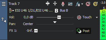 Si desea aplicar panoramización de pistas a envíos de buses (incluida la colocación de panoramizaciones y el modo de panoramización), haga clic con el botón secundario en el control de fundido del bus y seleccione Vincular a panoramización de pista principal en el menú contextual.