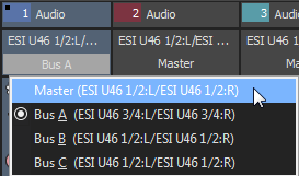 Si desea dirigir una pista a un bus, haga clic en el botón Salida y elija un bus en el menú: