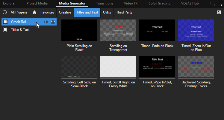 Wählen Sie Ansicht | Fenster | Mediengeneratoren, um die Anzeige des Fensters Mediengeneratoren umzuschalten. In diesem Fenster können Sie Text, Titel, Hintergründe und andere generierte Medien hinzufügen.