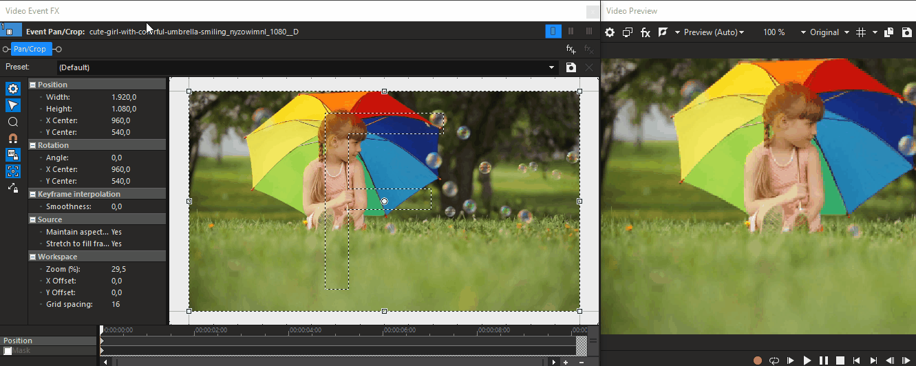 The Pan/Crop tool allows you to create masks that define which parts of a video event are visible or affected by video effects. You can use Bézier curves or shape tools to isolate areas of the frame, apply feathering, and combine multiple masks for complex results.