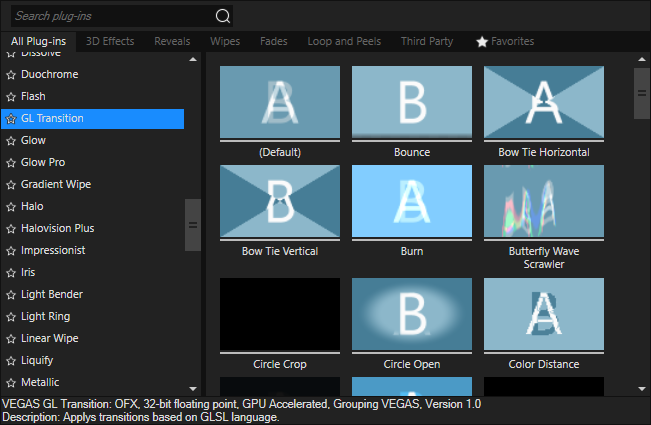 Choose View | Window | Transitions to display or hide the Transitions window. Use this window to choose and preview transition effects that you can use to control how a video event begins or ends, or to change the way one event flows into another.