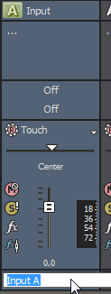 To rename an input bus, double-click the label at the bottom of the channel strip and type a new name in the box (or press F2 to rename the selected bus). The channel strip in the Mixing Console is updated when you press Enter.