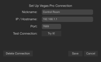 Use the Set Up VEGAS Pro Connection settings to name your connection and specify the address and port of the computer you noted in step 1e above.