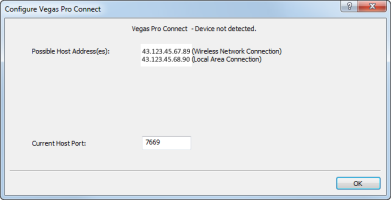 The Configure Vegas Pro Connect dialog displays a list of possible addresses for your computer and the port that will be used to communicate with your computer.