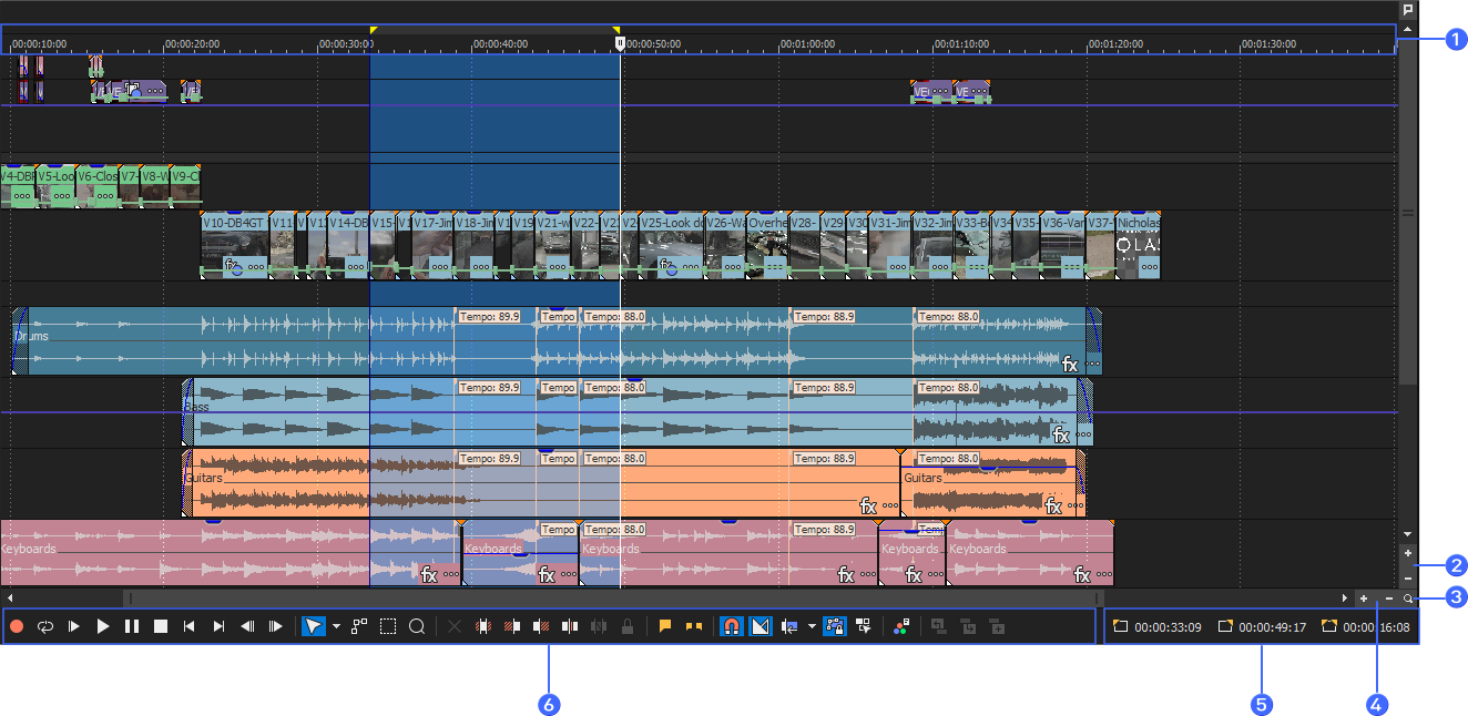 La escala de tiempo es el componente principal de la ventana de VEGAS Pro en el que llevará a cabo la mayor parte del trabajo. El espacio dedicado a las pistas propiamente dicho ocupa casi toda la ventana. Esta área contiene los eventos dibujados en cada pista.