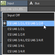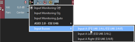 Si desea usar un bus de entrada como entrada de pista, haga clic en el botón Entrada de grabación en la cabecera de pista, seleccione Buses de entrada en el menú y elija un bus de entrada en el submenú: