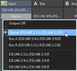 Para elegir un dispositivo de salida, haga clic en el botón Salida y elija un bus o una salida de hardware en el menú, o bien seleccione Salida desactivada.
