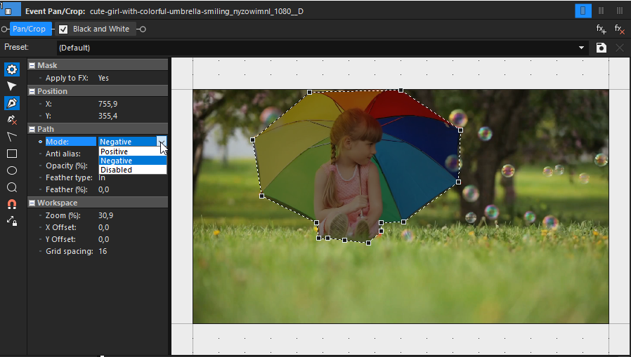 - Dans la fenêtre Panoramique/recadrage, allez dans la section Chemin et sélectionnez Positif ou Négatif dans le menu déroulant Mode.