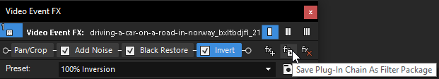 Em VEGAS Pro, você pode combinar vários efeitos de vídeo em um pacote reutilizável chamado Video FX Package. Esses pacotes preservam a cadeia completa de efeitos, incluindo todas as configurações de parâmetros, e podem ser aplicados em qualquer nível: