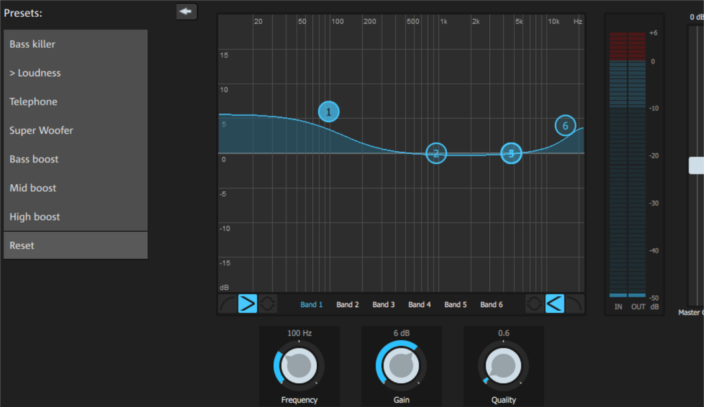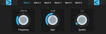 The blue bullets 1-6 symbolize the six frequency bands. You can move them around with the mouse until you find the frequency response you want. The bandwidth (Q value) can be adjusted using the mouse wheel.