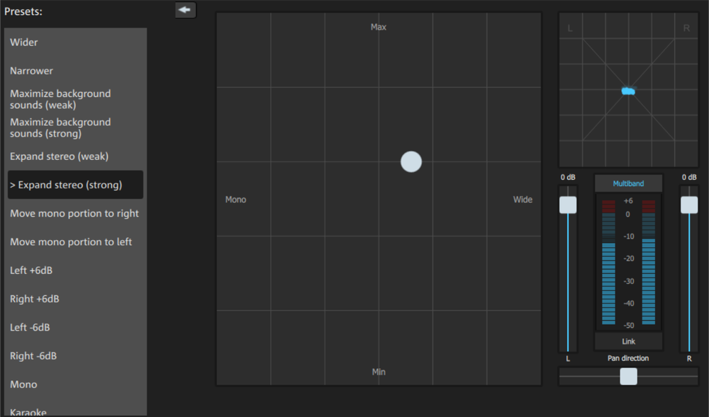 With the stereo enhancer you can determine the positioning of the audio material in the stereo balance. If the stereo recordings sound unfocused and undifferentiated, an extension of the stereo base-width can often provide better transparency.