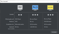 Aquí puedes escoger la grabadora, el formato del disco y la configuración del codificador. En el caso de DVD, se utilizará MPEG 2. Los discos Blu-ray utilizan MPEG 2, pero se utilizan bit rates superiores para alcanzar las mayores resoluciones. Los discos AVCHD utilizan el códec MPEG-4/H.264-Codec, que es más complejo. Encontrarás más información en el anexo "Configuración del codificador de MPEG 4" del manual en PDF o con la tecla F1.