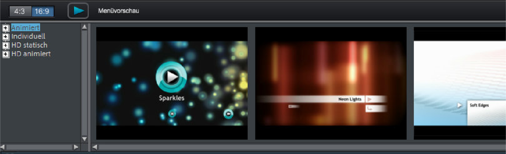 A la izquierda se encuentra la estructura de árbol para seleccionar diversos tipos de plantillas de menú. Arriba, debes primero configurar si las plantillas deben utilizarse en formato "16:9" o "4:3".