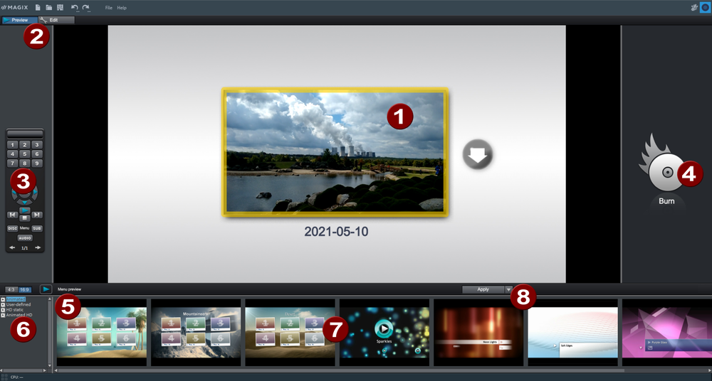 En el modo "Edición", cuentas con numerosas posibilidades para el diseño del menú de tu disco. También aquí están disponibles plantillas que puedes adaptar y cambiar flexiblemente.