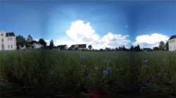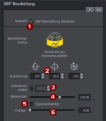 El "ángulo de cámara“ (3) viene predeterminado, para vídeos 360° tiene un valor fijo de 360°. En fotos panorámicas con un ángulo de cámara más reducido se puede activar aquí la casilla para configurar otro valor de ángulo. Un valor "adecuado" se logra tan solo evaluando a ojo, es necesario pues ajustar cuidadosamente la medida de los grados hasta que el resultado se considere acertado.