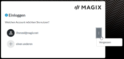 Introduce tu dirección de correo electrónico (si ya habías iniciado sesión) o haz clic en el signo + para seleccionar otra cuenta MAGIX.