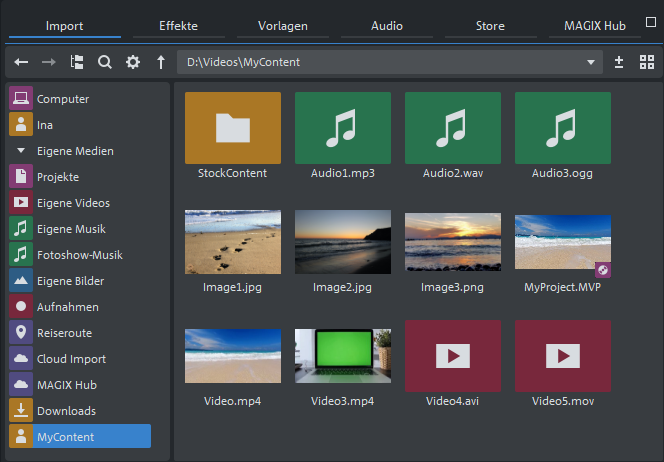 El Grupo de medios de Video deluxe es un área central que te ofrece amplias posibilidades para administrar y utilizar tus archivos multimedia. Aquí no solo puedes importar tus propios archivos multimedia, sino también acceder a una gran variedad de efectos, plantillas y otros contenidos. Además, puedes descargar contenidos de la Store a través del Grupo de medios y acceder en MAGIX Hub al contenido de archivo y a la información de tu perfil.