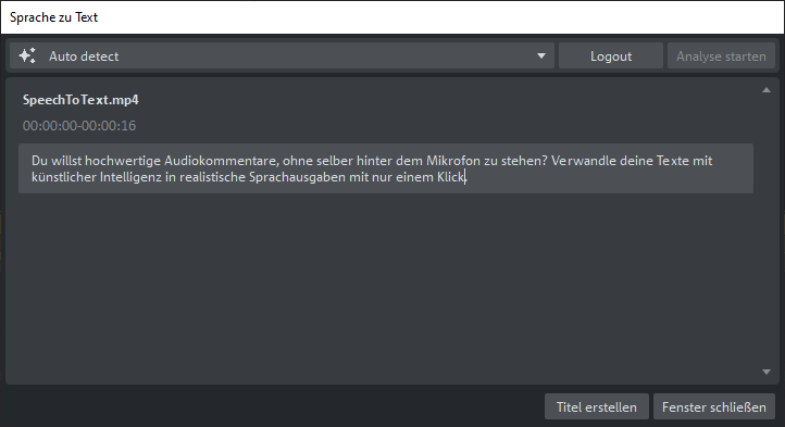 La fonction de reconnaissance vocale détecte la parole contenue dans les fichiers audio et vidéo et la convertit en objets titre synchronisés qui s'affichent sous forme de texte sur des pistes séparées. Ceux-ci peuvent être personnalisés, mis en évidence ou exportés de manière flexible.
