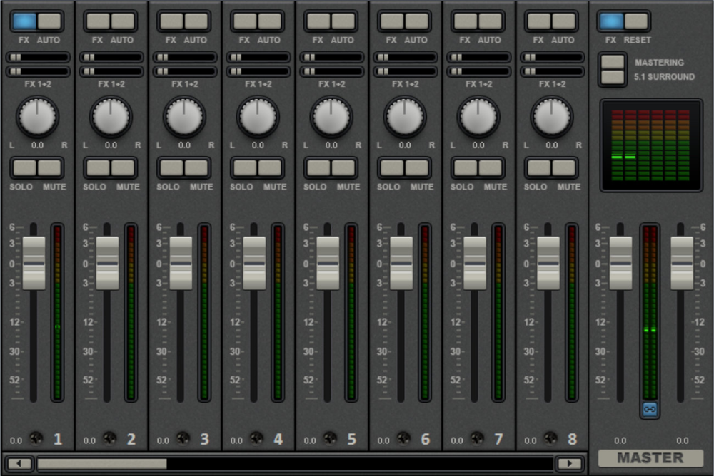 Le bouton FX et les emplacements des plug-in fonctionnent exactement comme pour les autres pistes. Le bouton FX permet d'ouvrir le rack d'effets audio master. En cliquant sur Reset, vous pouvez réinitialiser tous les paramètres de la table de mixage, y compris les canaux d'effets.