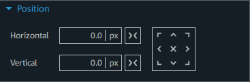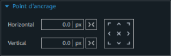Ces valeurs permettent de déplacer l'objet par rapport à son point d'ancrage. Saisissez une valeur absolue (px) ou relative (%) pour définir la position du point d'ancrage. L'objet se déplace en fonction du point d'ancrage défini précédemment. Cliquez sur l'unité pour basculer entre pixels et pourcentage. |