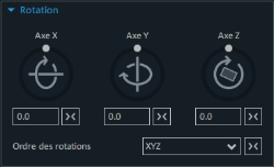 Le calque dans lequel l'élément se trouve peut effectuer une rotation selon les trois axes spatiaux (X, Y, Z). Le point d'ancrage correspond également au centre de rotation. L'angle de rotation peut être réglé directement à l'aide des trois commandes ou être entré en degrés dans les champs correspondants. Les rotations réglées sont appliquées les unes après les autres. L'ordre utilisé à cet effet peut être défini à l'aide du champ de sélection. Cela peut être nécessaire dans certaines situations, si l'on souhaite régler plus d'une rotation ou appliquer une rotation autour de plus d'un axe.