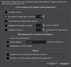Cette option permet de positionner automatiquement des marqueurs de chapitre dans le projet en fonction de certaines règles, ce qui formera la structure des chapitres dans le menu d'un film gravé sur disque. Cela est utile si vous souhaitez graver un disque directement après un enregistrement.