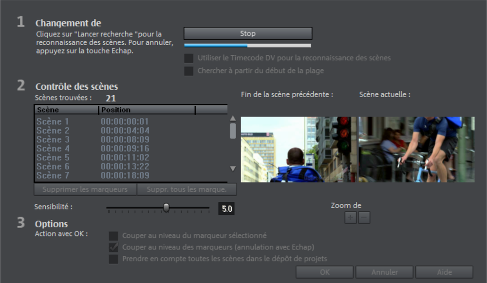 Chargez la vidéo de votre choix dans la fenêtre du projet. Ensuite, cliquez à droite sur la vidéo puis sur l'option « Reconnaissance des scènes ». La boîte de dialogue suivante apparaît alors :
