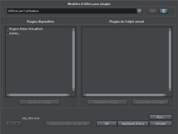 Paramètres de plug-in : ouvre la boîte de dialogue des paramètres pour le plug-in sélectionné. Tous les paramètres de plug-in de la liste complète peuvent être enregistrés conjointement en tant que préréglages (modèles d'effets pour plug-ins).