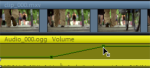 Wenn Sie mit dem Mauszeiger diese Linie berühren, verwandelt sich der Mauszeiger vom Handsymbol in einen Pfeil. Klicken Sie nun auf die Linie, erstellen Sie einen Punkt (Keyframe), den Sie mit dem Mauszeiger anfassen und nach unten verschieben können. Damit senken Sie die Lautstärke über das gesamte Objekt ab.