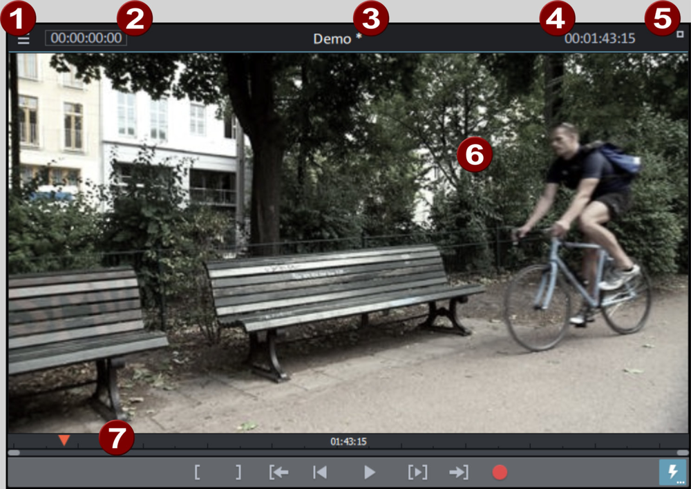The playback button in the middle starts playback. A second click stops playback. TIP In the menu File > Settings > Program > Playback, you can set whether the playback marker will go back to the start position (stop) after the second click or following the appropriate shortcut (space bar), or if it should stay at the current position (pause function). |