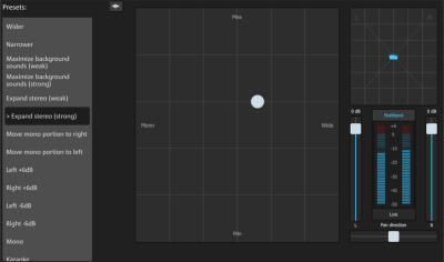 With the stereo enhancer you can determine the positioning of the audio material in the stereo balance. If the stereo recordings sound unfocused and undifferentiated, an extension of the stereo base-width can often provide better transparency.
