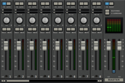 The master channel is located to the right of the individual channels. This controls the overall sound and also offers all editing options: volume, panorama, plug-ins and effects.