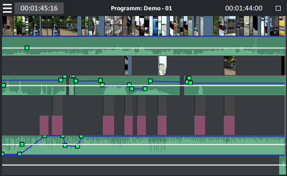The option Movie overview in the Window menu provides an overview of the entire project. All objects in the project window are displayed in the program monitor. The overview display is especially recommended for working on long movies because the reduced overview in the program monitor can be combined well with the zoomed detailed view in the project window.