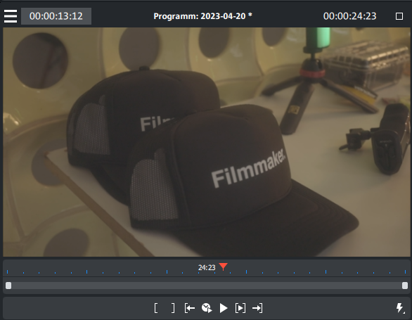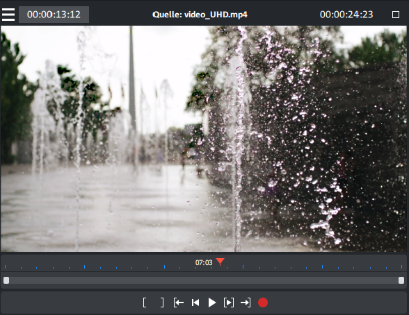 The playback button in the middle starts playback. A second click stops playback. TIP In the menu File > Settings > Program > Playback, you can set whether the playback marker will go back to the start position (stop) after the second click or following the appropriate shortcut (space bar), or if it should stay at the current position (pause function). |