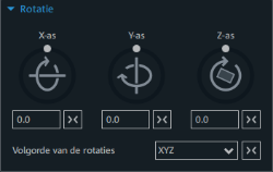 Het vlak waarop het element is opgesteld kan worden geroteerd rond de drie ruimtelijke assen (X, Y, Z). Het ankerpunt dient ook als het draaipunt. De draaihoek kan rechtstreeks worden ingesteld met de drie bedieningselementen of worden ingevoerd in graden ° in de waardevelden. De ingestelde rotaties worden na elkaar toegepast. De volgorde die hiervoor wordt gebruikt, kan worden ingesteld via het selectieveld. Dit kan nodig zijn in sommige situaties wanneer u meer dan één rotatie wilt instellen of om meer dan één as wilt roteren.