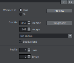 Gebruik de invoerknop om een absolute (px) of relatieve waarde (%) in te voeren voor breedte en hoogte. De relatieve waarde verwijst naar de filmgrootte, de absolute waarde naar de grootte van het object. Klikt u de eenheid om te schakelen tussen pixels en procenten. |