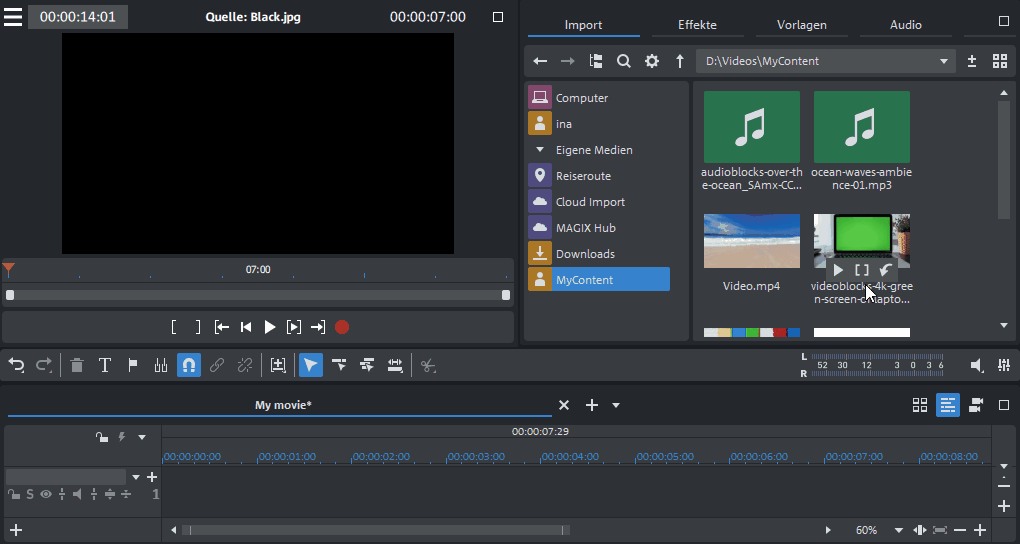 Speel het geselecteerde bestand in de previewmonitor af en bepaal het gedeelte, waarin u het project wilt gebruiken.