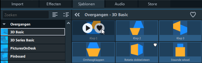 Hier vindt u direct te gebruiken sjablonen in verschillende categorieën zoals overgangen, titelsjablonen etc. |