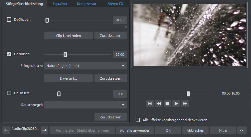 Im Kontextmenü von Audio-Objekten öffnen Sie den Editor „Audio Cleaning“ zur Korrektur von Störungen im Audiomaterial.