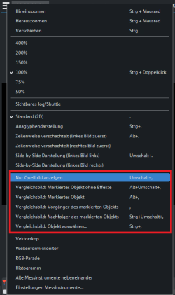 Markiertes Objekt: Das markierte Objekt wird mit allen angewendeten Effekten angezeigt. So können Sie den Abspielmarker durch das Projekt bewegen und z. B. den Anfang und das Ende eines bearbeiteten Objektes miteinander vergleichen. Der Abspielmarker wird bei dieser Option nicht zwischen Programm- und Quellmonitor synchronisiert.